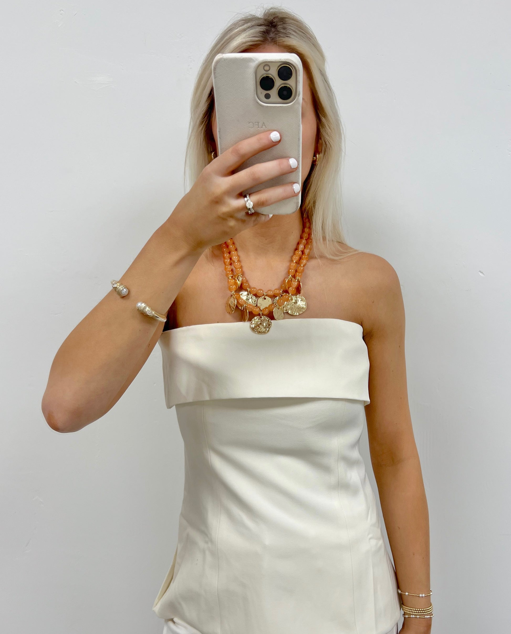 What makes this necklace unique? * 18.5" + 3" Extender * Amber Glass Gemstone * Metallic Gold Coin Charms * Lobster Claw Clasp