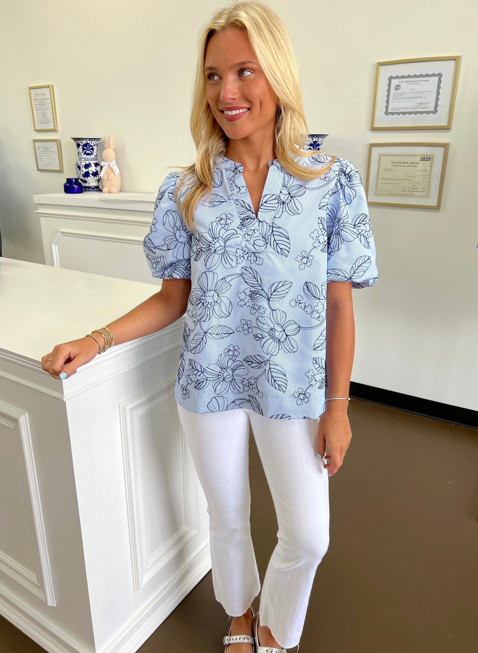 Make a statement in the Brynlee Embroidered Top! Featuring intricate navy embroidered details and a flattering v-neck, this top adds a touch of elegance to any outfit. Perfect for a day at the office or a night out with friends. Elevate your wardrobe with this must-have piece!