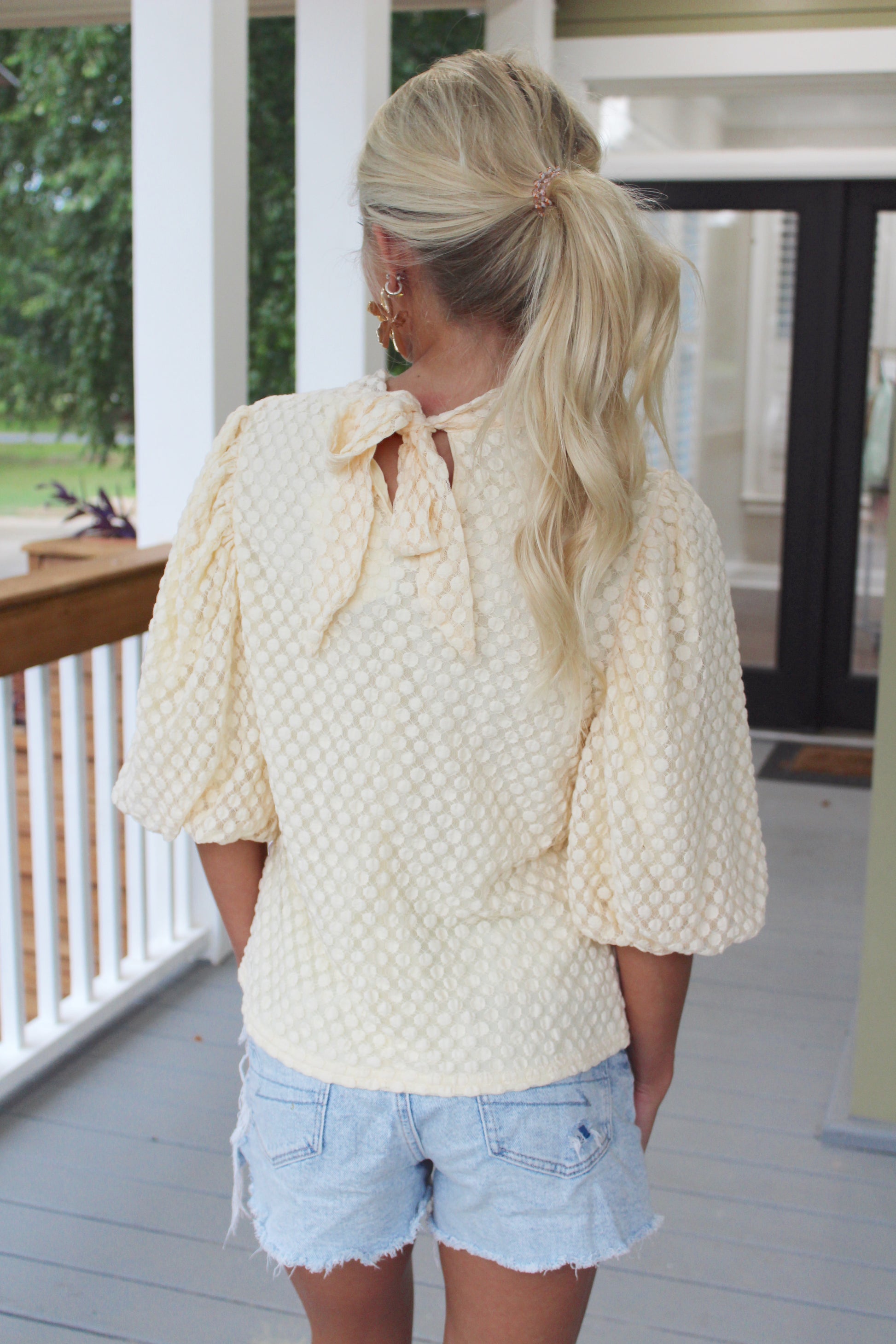 Enhance your wardrobe with this sophisticated Bubble Lace Sleeve Top. The mock neckline and tie back detail add a touch of elegance, while the elbow length bubble sleeves and relaxed fit provide both comfort and style. Made with charming polka dot lace, this top is a must-have for any fashion-forward individual.