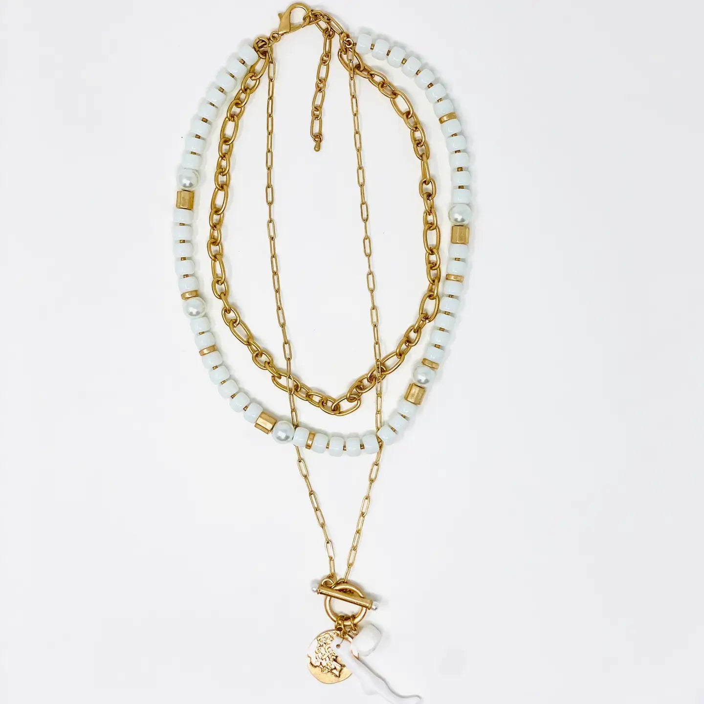 Gold plated, multilayered necklace with 3 charm adornment with toggle.