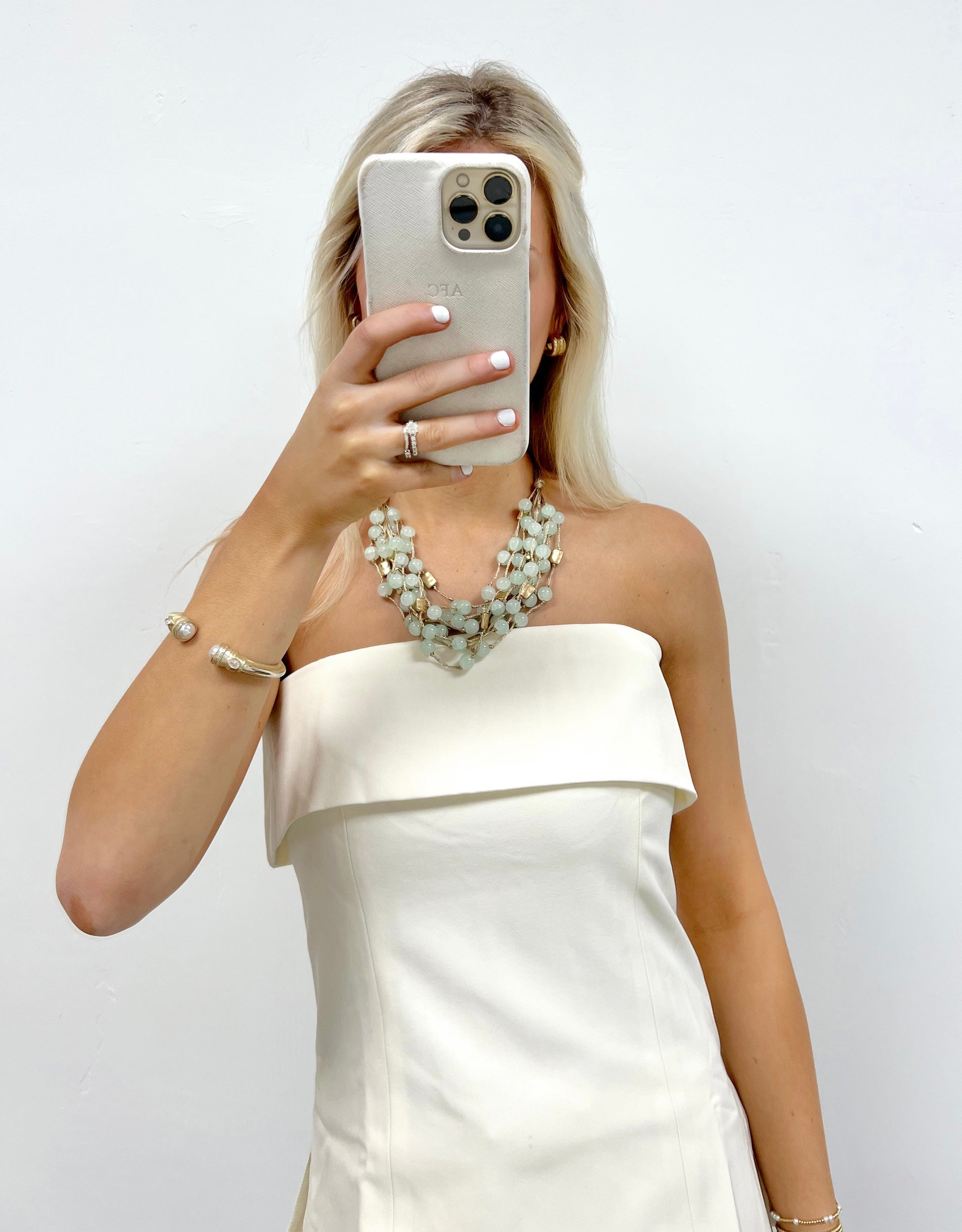 What makes this necklace unique? * 18.5" + 3" Extender * Shiny metallic gold silk thread, iridescent emerald green glass beads * Gold enamel hammered findings add a luxurious touch * lobster claw clasp