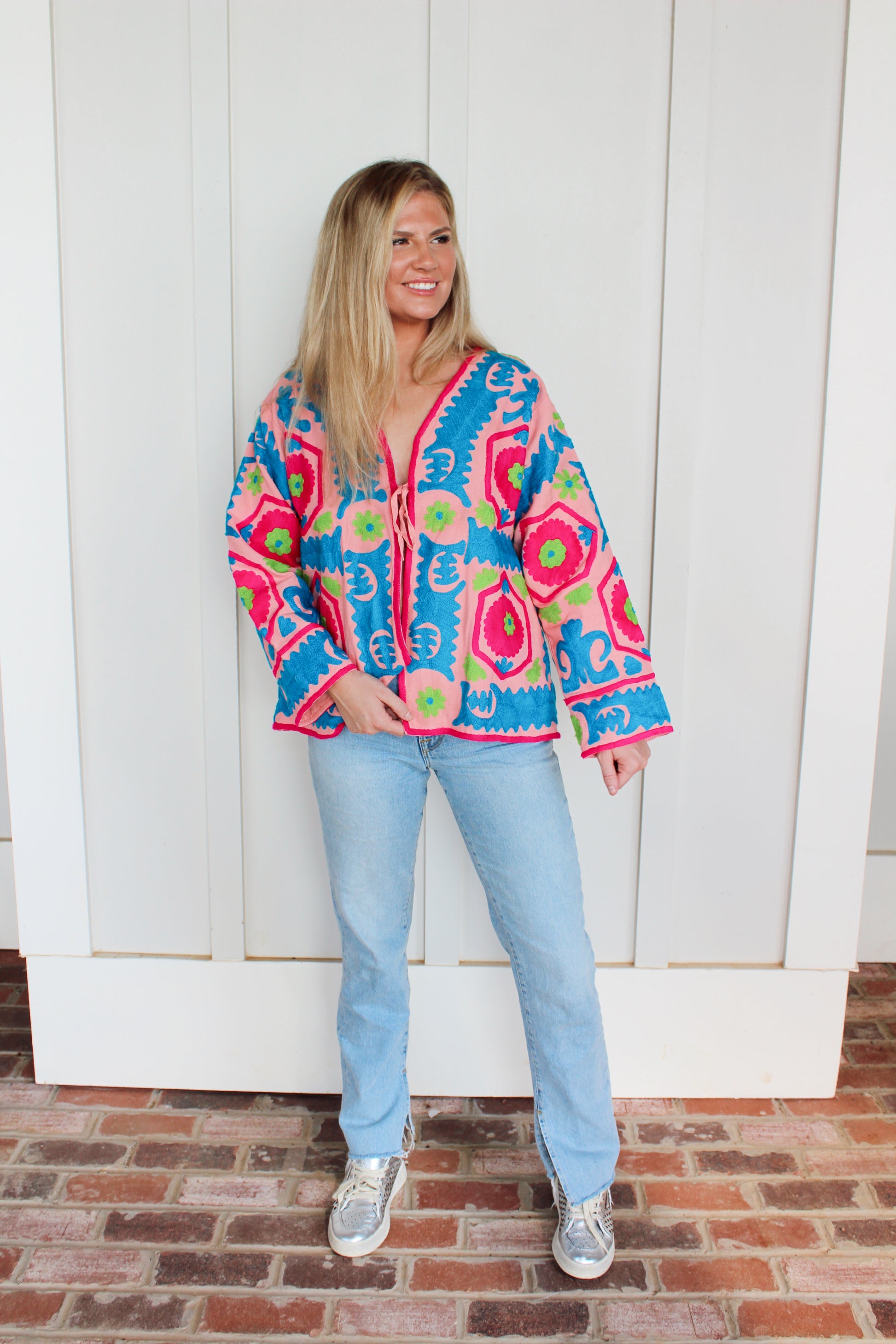 Handcrafted using Block Printing and Skilled Embroidery in India. This jacket is perfect for spring, summer, or fall! Roll the sleeves up and pair with a dress to add a pop of color! These are soft, beautiful, and all the RAVE! 100% Cotton Duck Cloth Fabric *Runs a little oversized-sizes are combined and come in S/M, L/XL