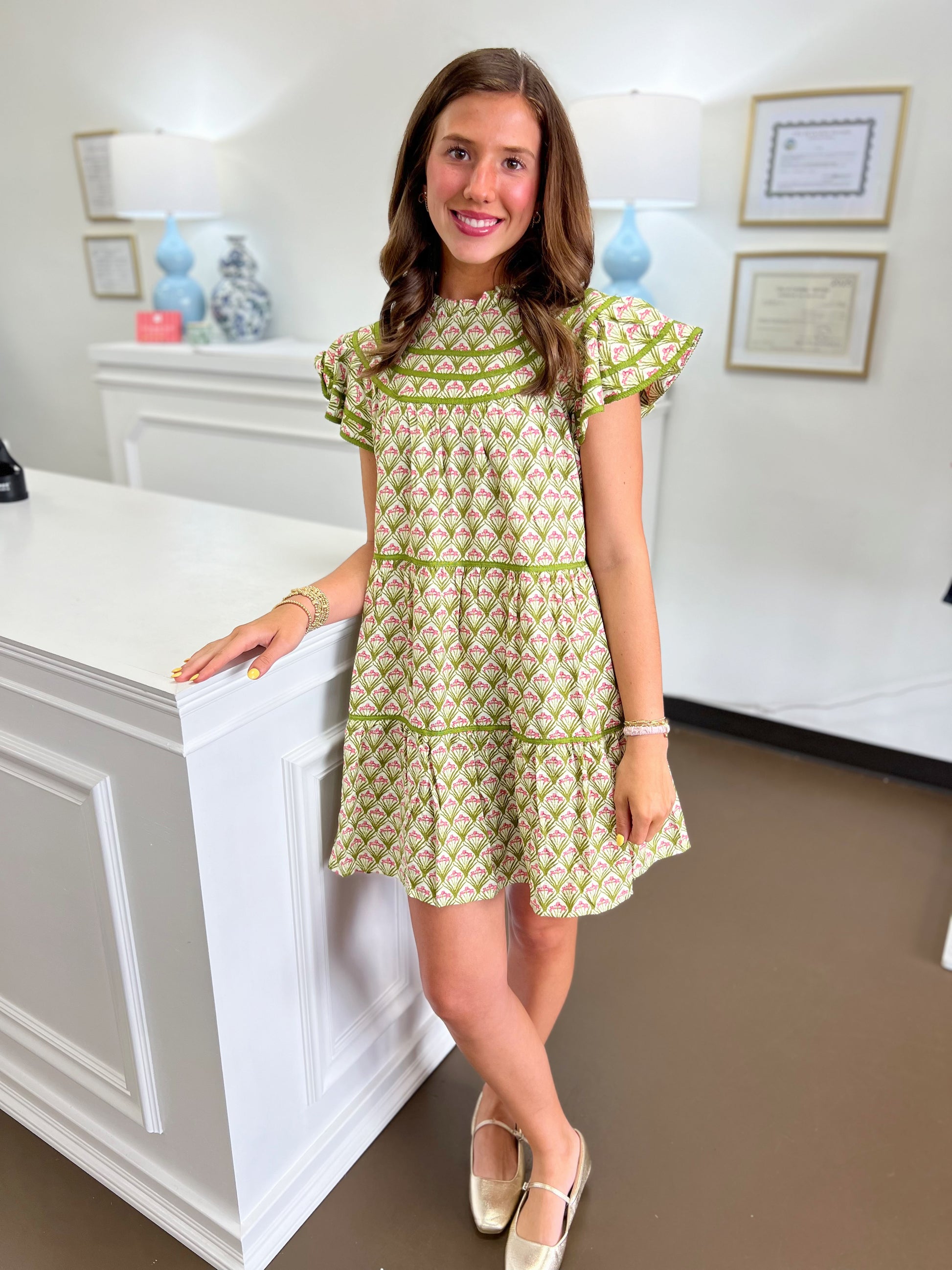The Emory Abstract Printed Dress features a playful ruffled neck and delicate trim details, adding a touch of femininity to your wardrobe. Let this dress inspire your inner free spirit and make a statement with its unique and abstract print. Stand out with style and grace in this versatile dress!