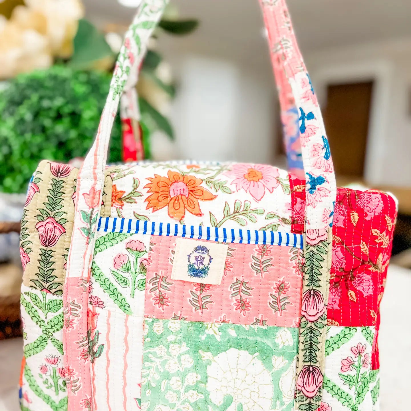 Our fanciest mini duffel to date inspired by some of our favorite prints! Our Heart of Grace Quilted Tote Collection will be a new customer favorite! These are hand quilted and crafted in India using block printing. Bag measurements: 14” x 6” Zipper closure