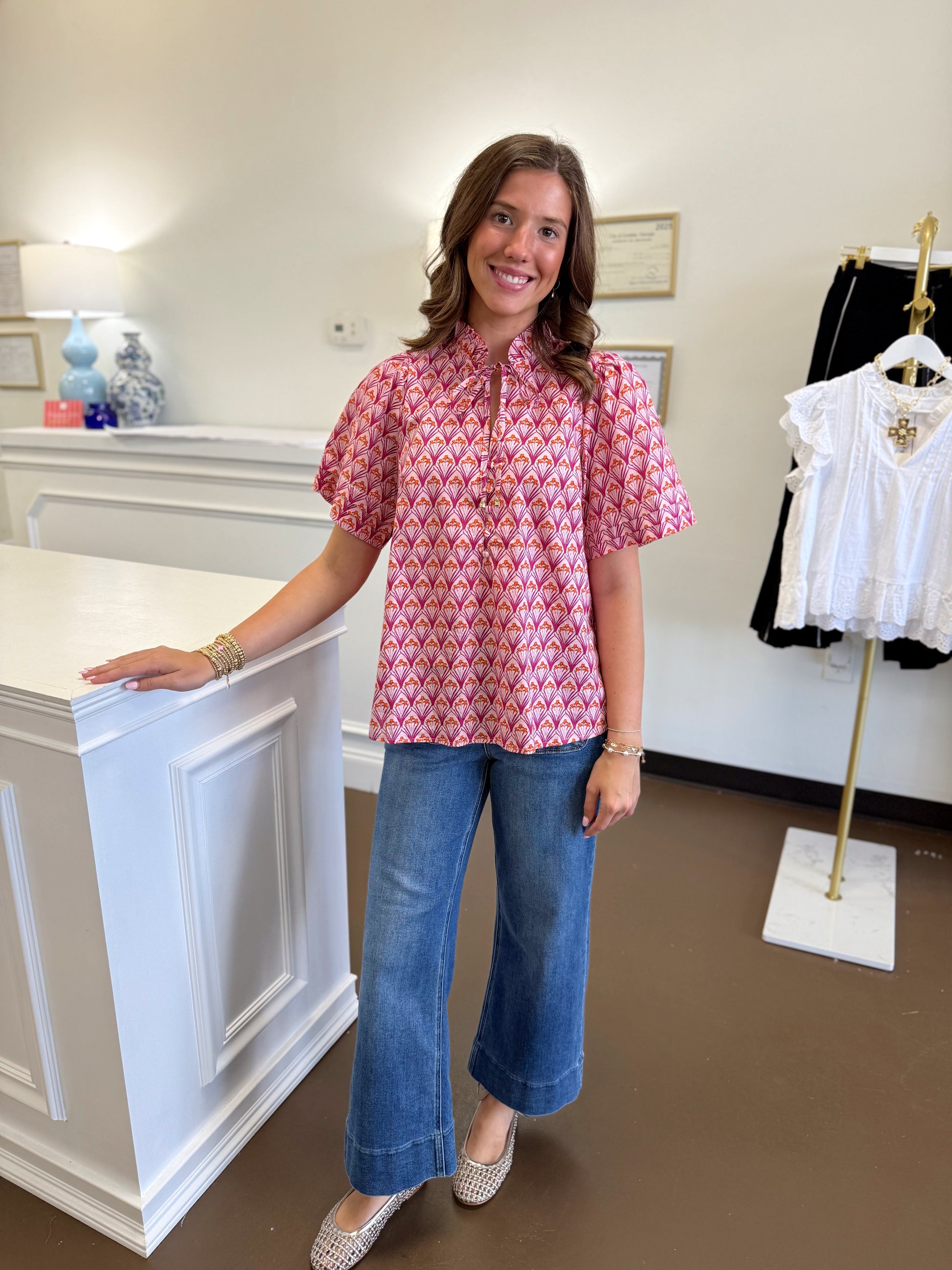 Geometric print short sleeve top featuring a ruffled mock neck and adjustable self-tie detail at neckline. Tie-front closure. Unlined. Woven. Non-sheer. Lightweight.