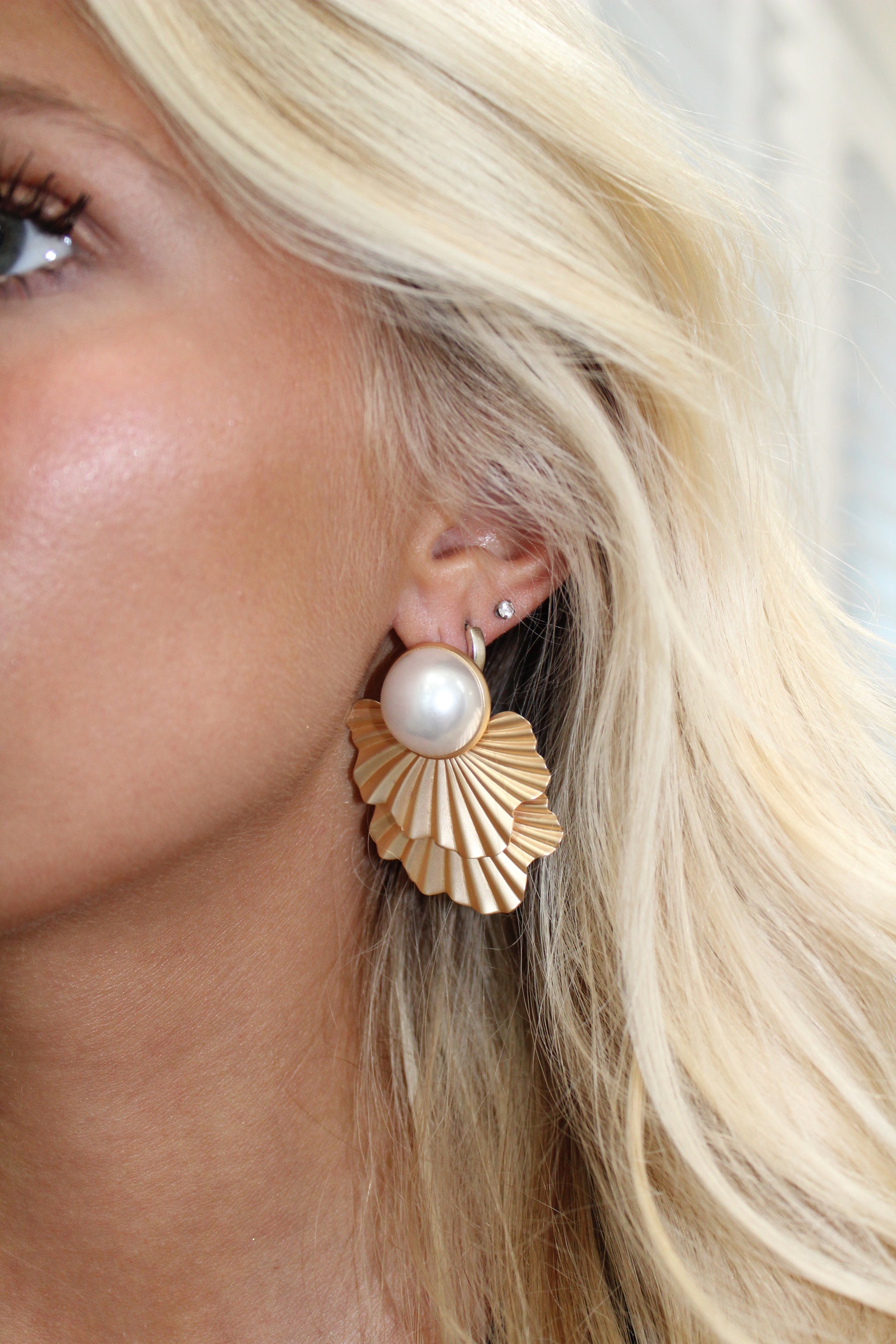 Elevate your style with our Gold Pearl Pleated Earrings. Crafted with round pearls and pleated metal, these earrings exude elegance and sophistication. Perfect for any occasion, these earrings will add a touch of glamour to any outfit. Make a statement with these timeless and classic pieces.