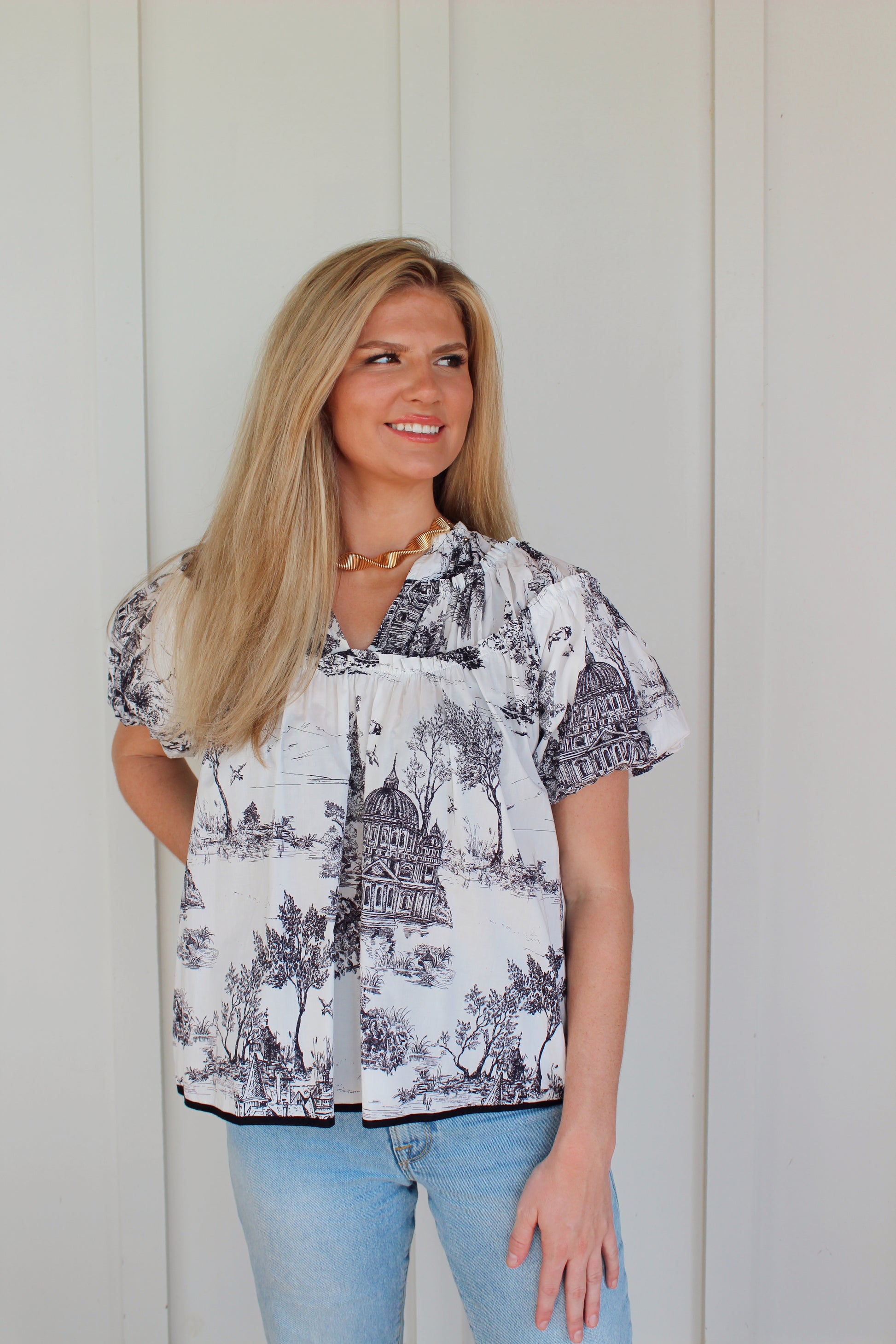 Expertly crafted with a timeless toile pattern, this Kelly Toile Printed Top offers a touch of elegance to any outfit. The flattering puff sleeves add a feminine touch, while the classic black and white color scheme makes it perfect for fall. Elevate your wardrobe with this versatile and stylish top.