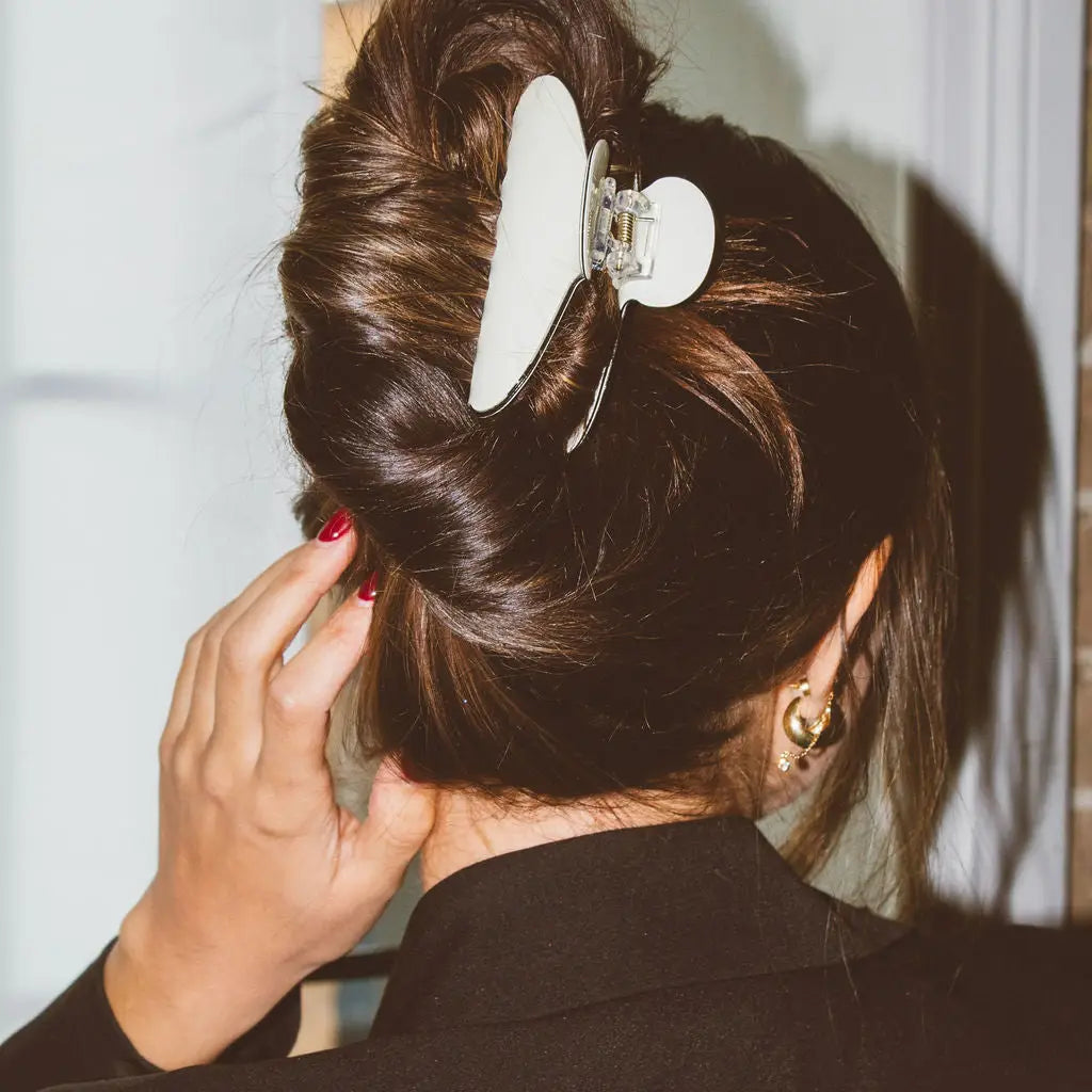 Our clips put a beautiful Andi touch on the hair clips you thought you knew. This claw clip is a simple but elegant, white clip with a black trim, and is made of high-quality acetate. Pair this with any outfit this season to add a chic and minimal touch. It is a medium, 3.25-inch claw clip.