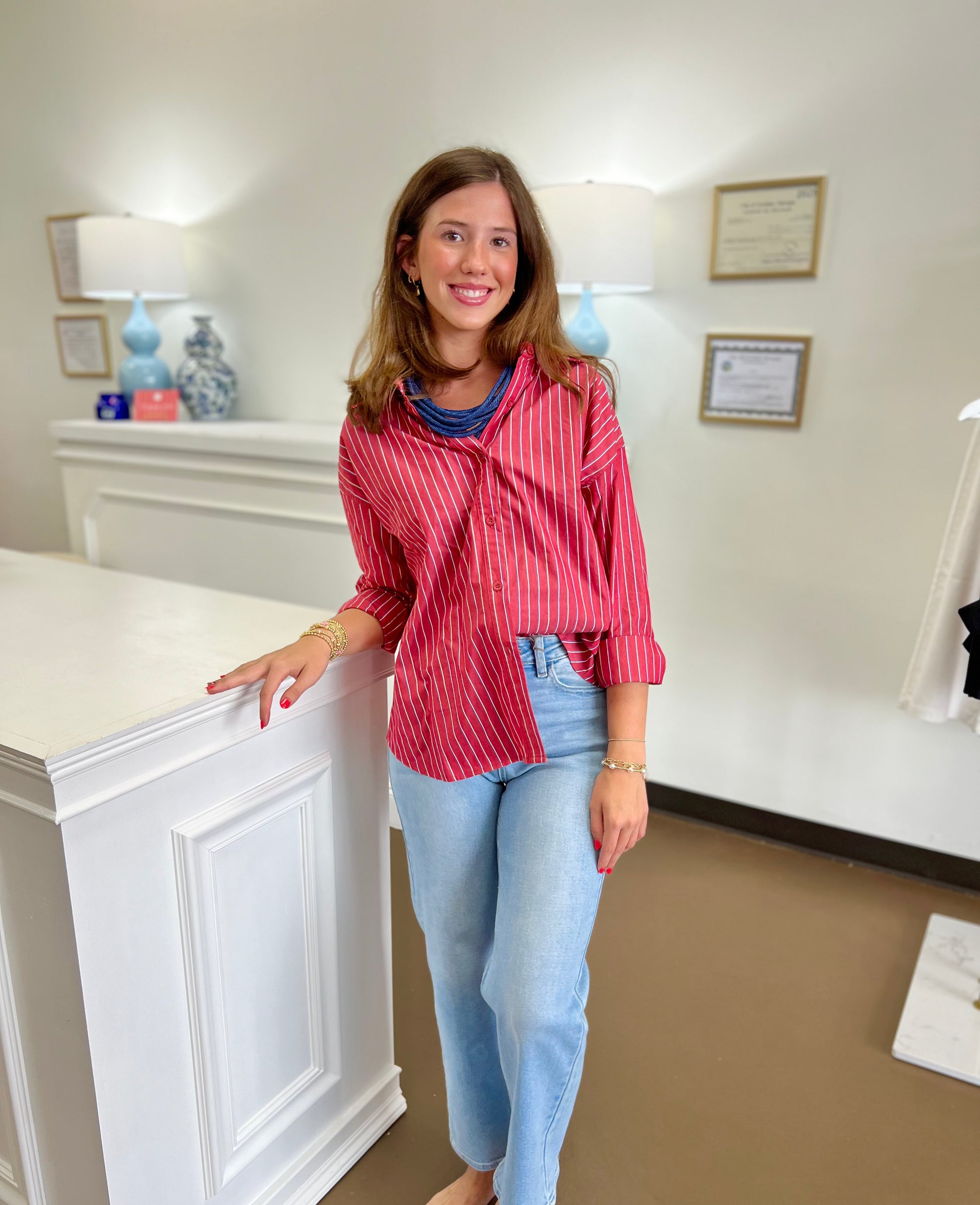 This oversized top features bold red, white, and blue stripes that make a striking statement. Designed with a classic button-down closure, it offers both style and ease of wear. Perfect for adding a vibrant, casual touch to your wardrobe, this top combines comfort with eye-catching design.