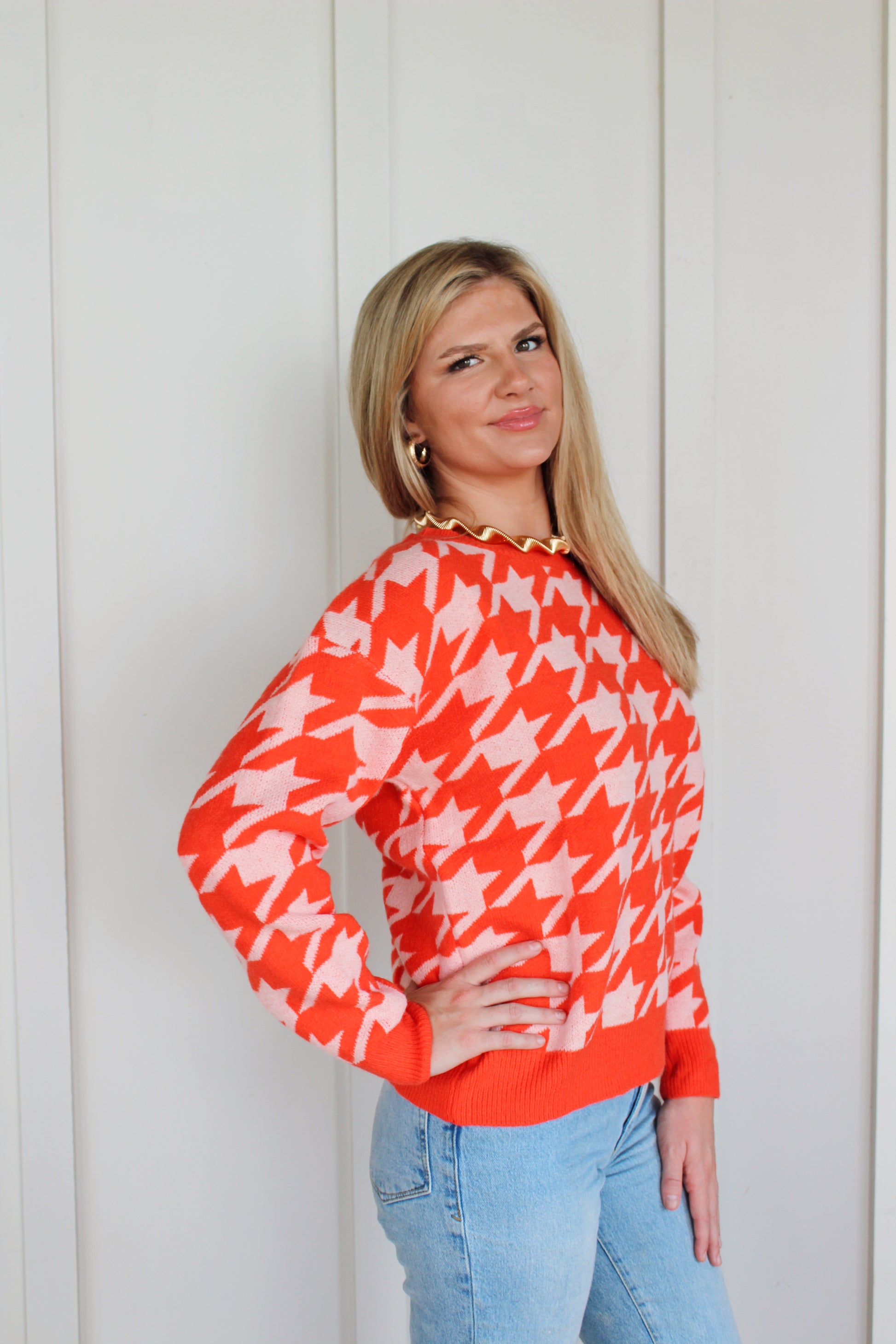 Expertly crafted from high-quality, lightweight sweater material, the Rachel Houndstooth Sweater boasts a classic houndstooth pattern in a bold, bright orange color. With its timeless design and comfortable fit, this sweater is the perfect addition to any wardrobe. Stay stylish and comfortable in this must-have piece.