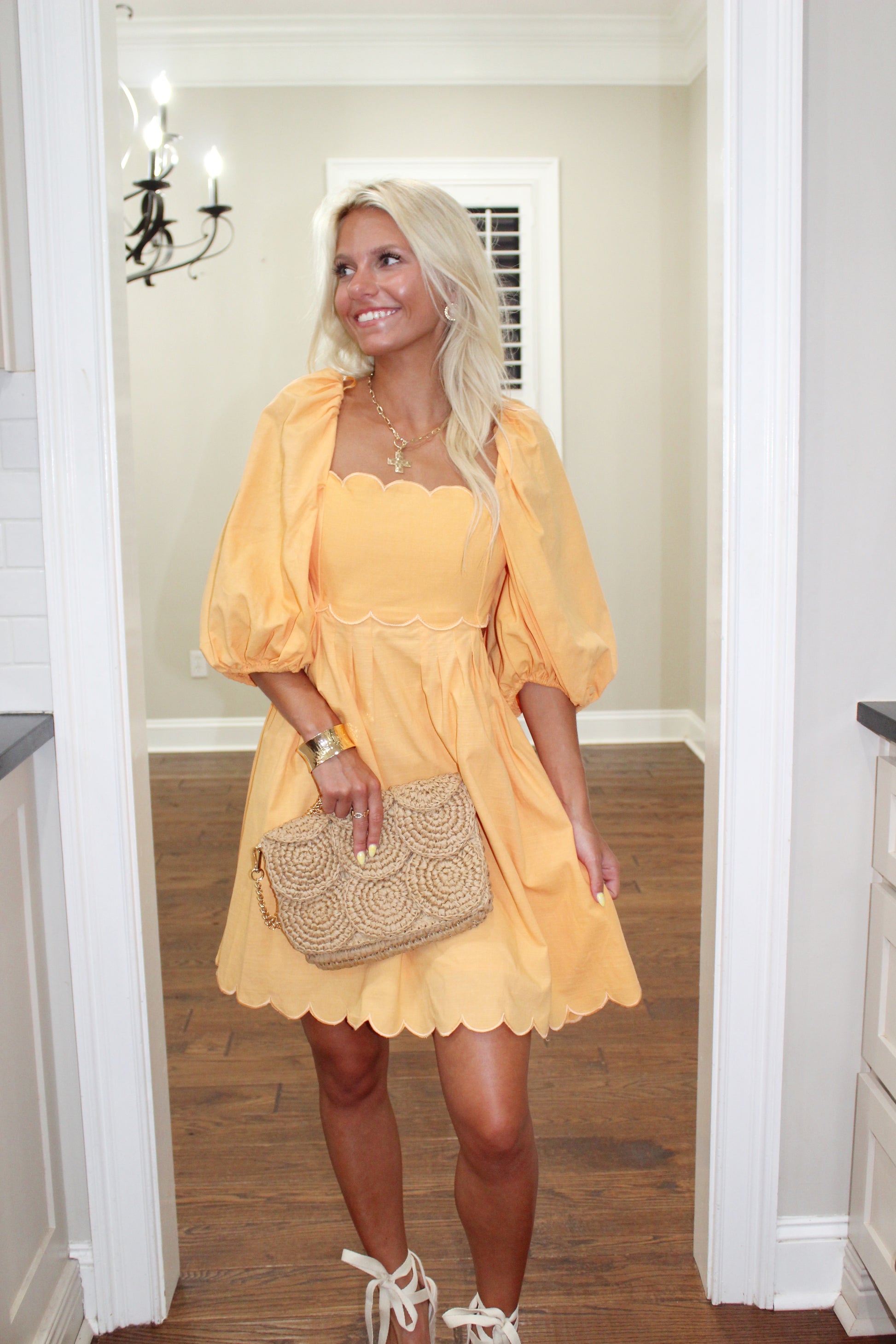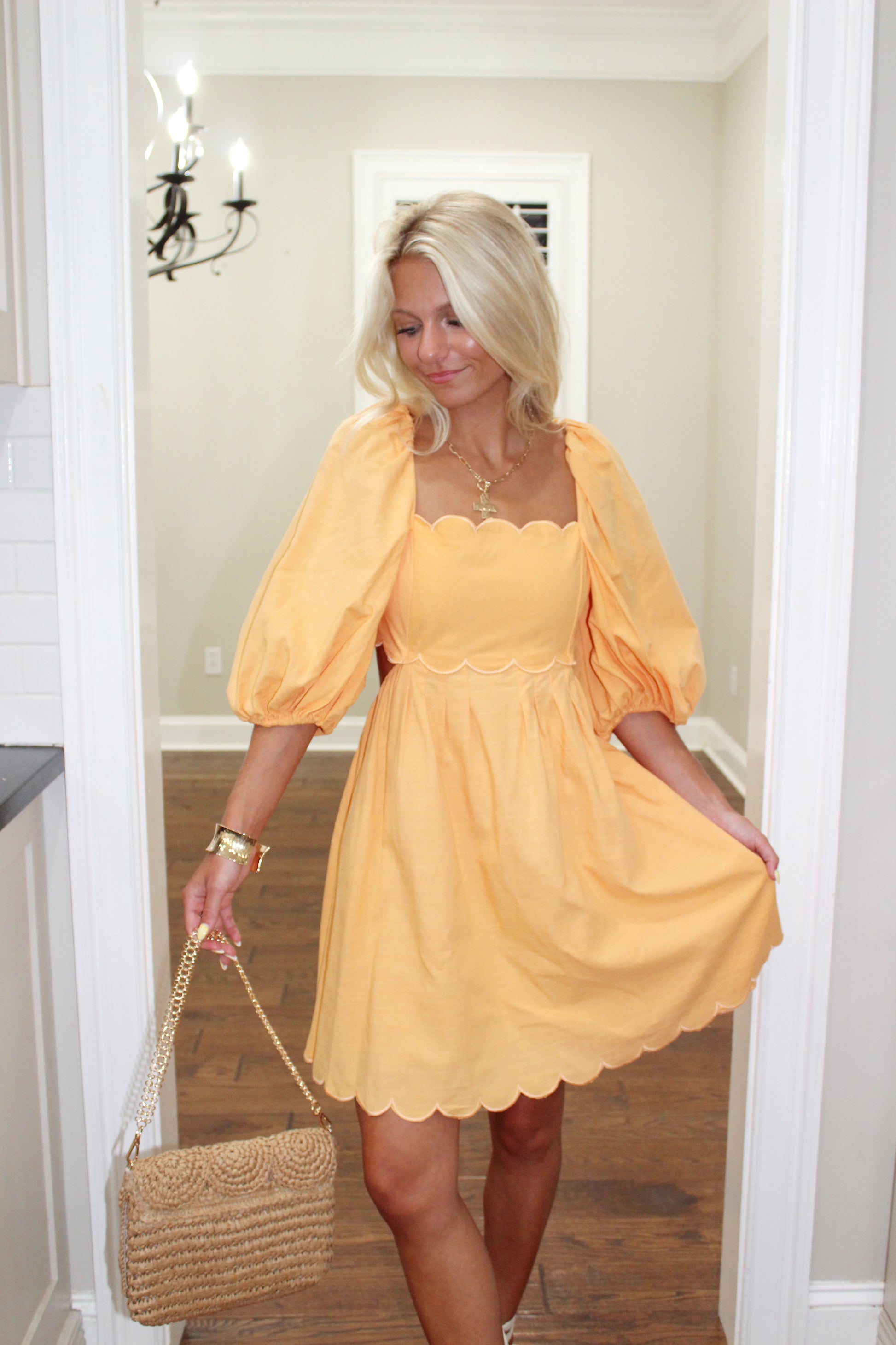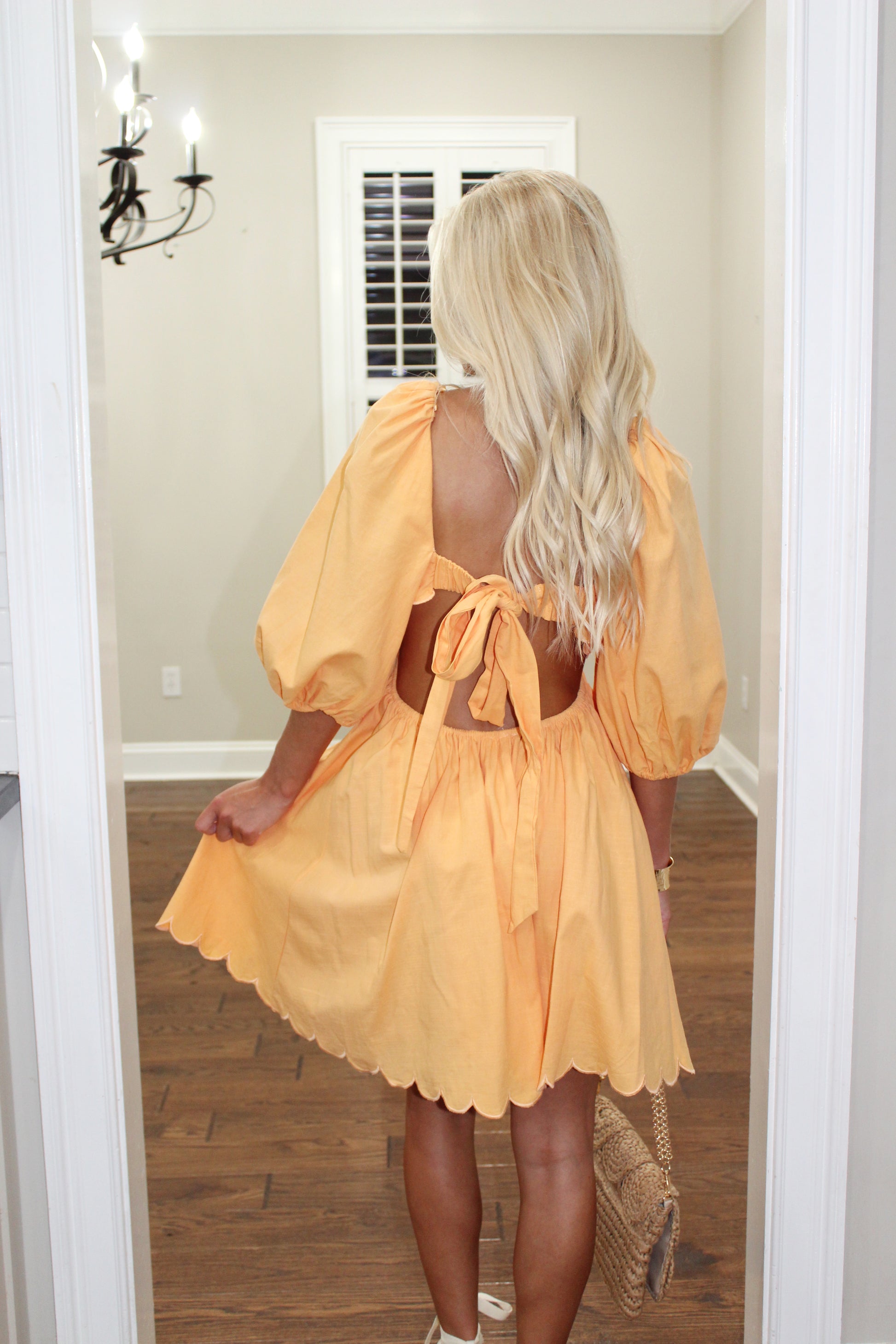 This short puff sleeve baby doll dress features delicate neckline and hemline scallop embroidery, adding a touch of elegance to its playful silhouette. The open back design, complete with a self tie, offers a flattering and adjustable fit. Perfect for any occasion, this dress is a must-have addition to your wardrobe.