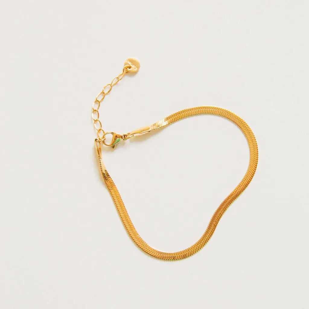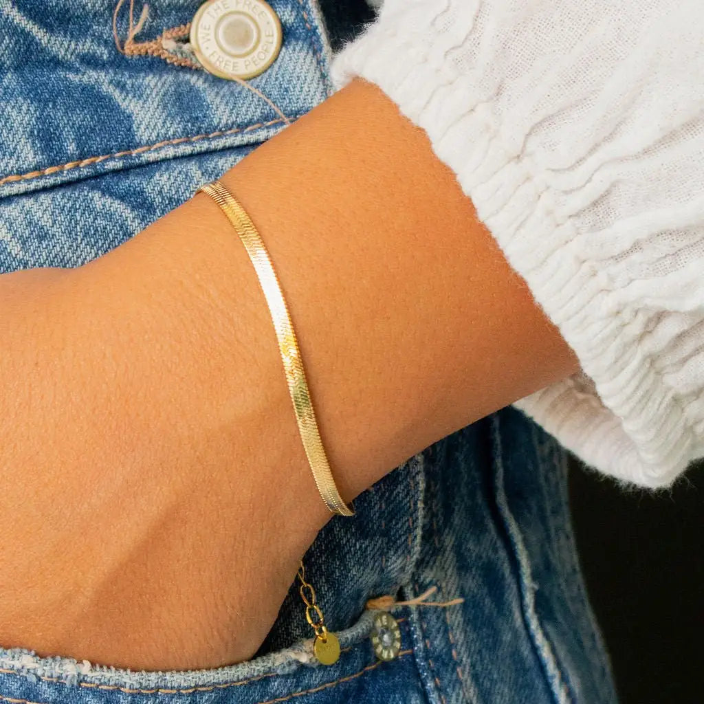 This stunning bracelet is the most perfect staple you could every wish for. It is a flat gold snake chain made out of a high quality stainless steel material that is water/tarnish resistant, making it perfect for everyday wear. It has an adjustable clasp so it'll fit your wrist perfectly. I am in love with this piece!