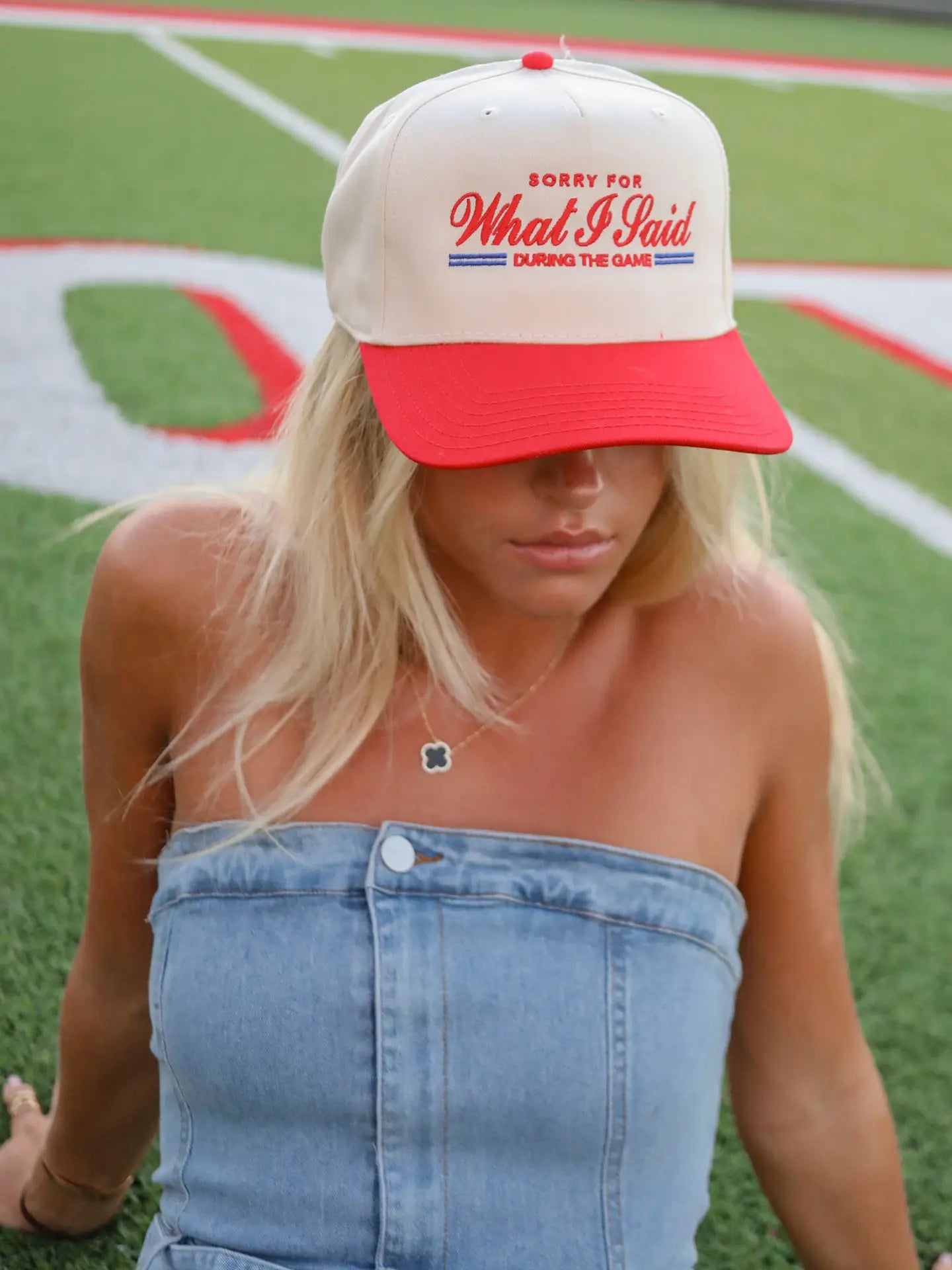 "I'm sorry for what I said during the game" is back on a new ivory and red two tone trucker! This hat features a dual font graphic with hints of blue to make it a timeless classic for any football fan that just can't contain it!
