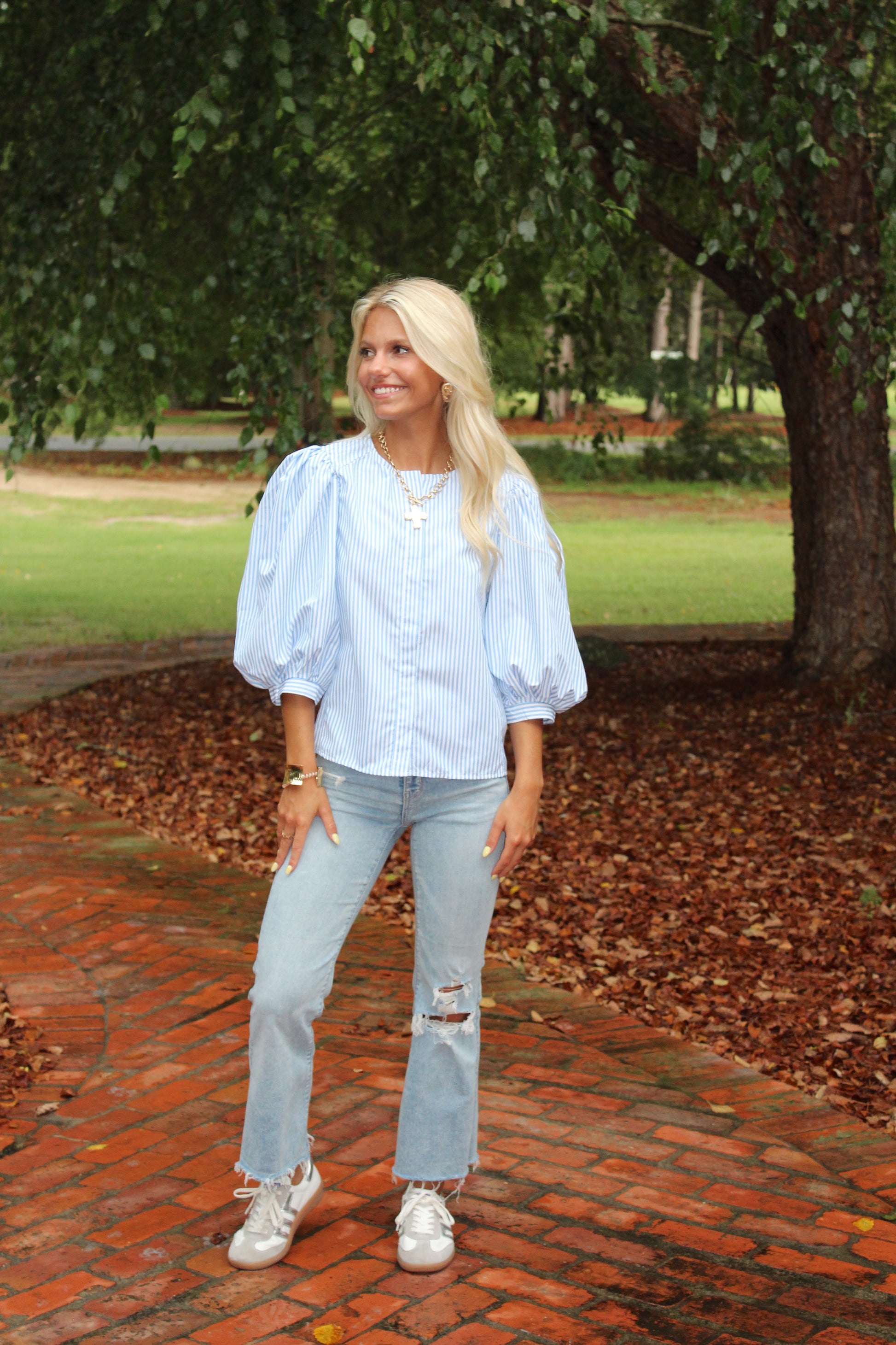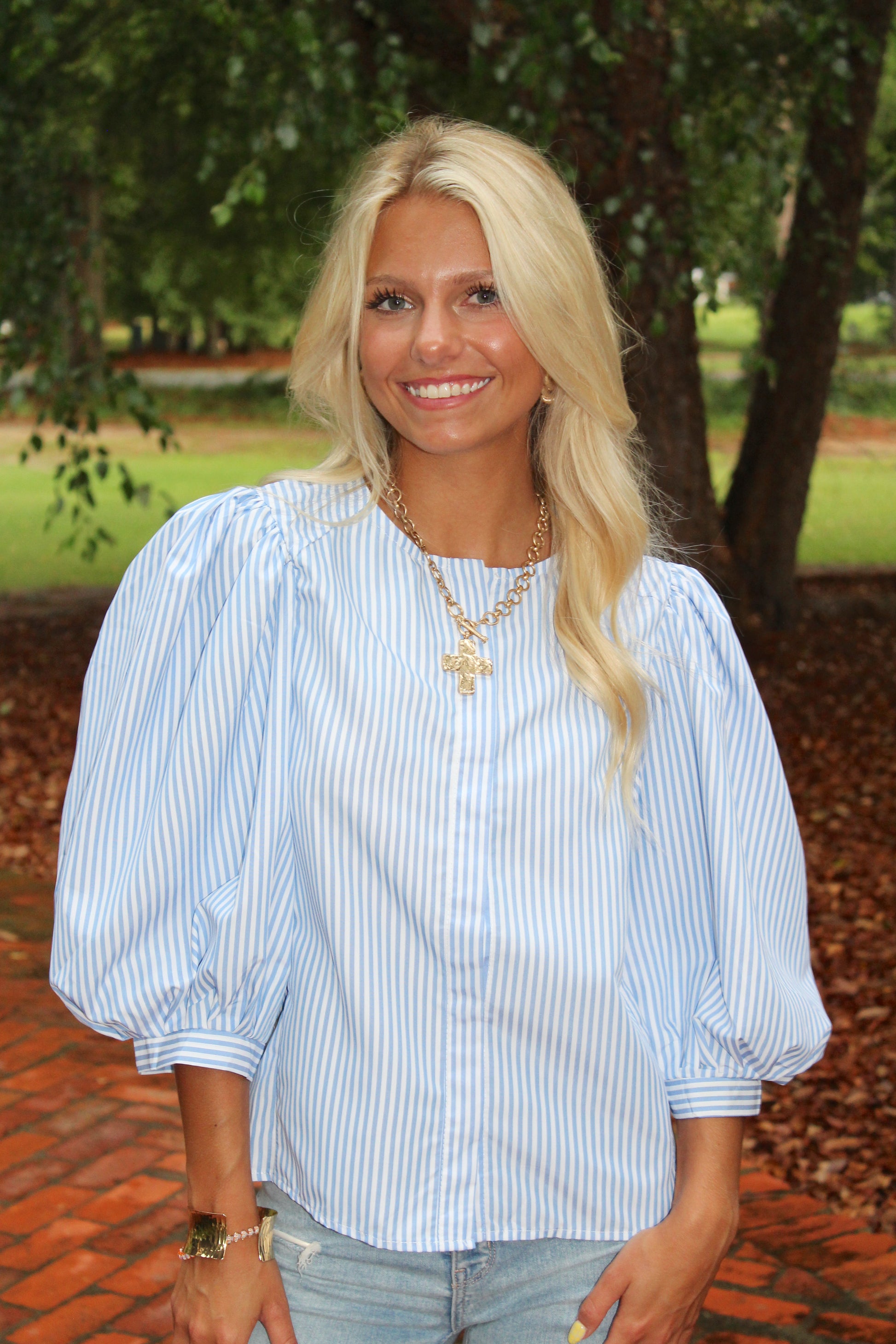 Effortlessly stylish, this Striped Button Down Top features a hidden button down closure and lightweight fabric for a comfortable fit. The light blue stripes give it a classic touch, making it perfect for any occasion. Stay cool and chic with the long sleeve design.