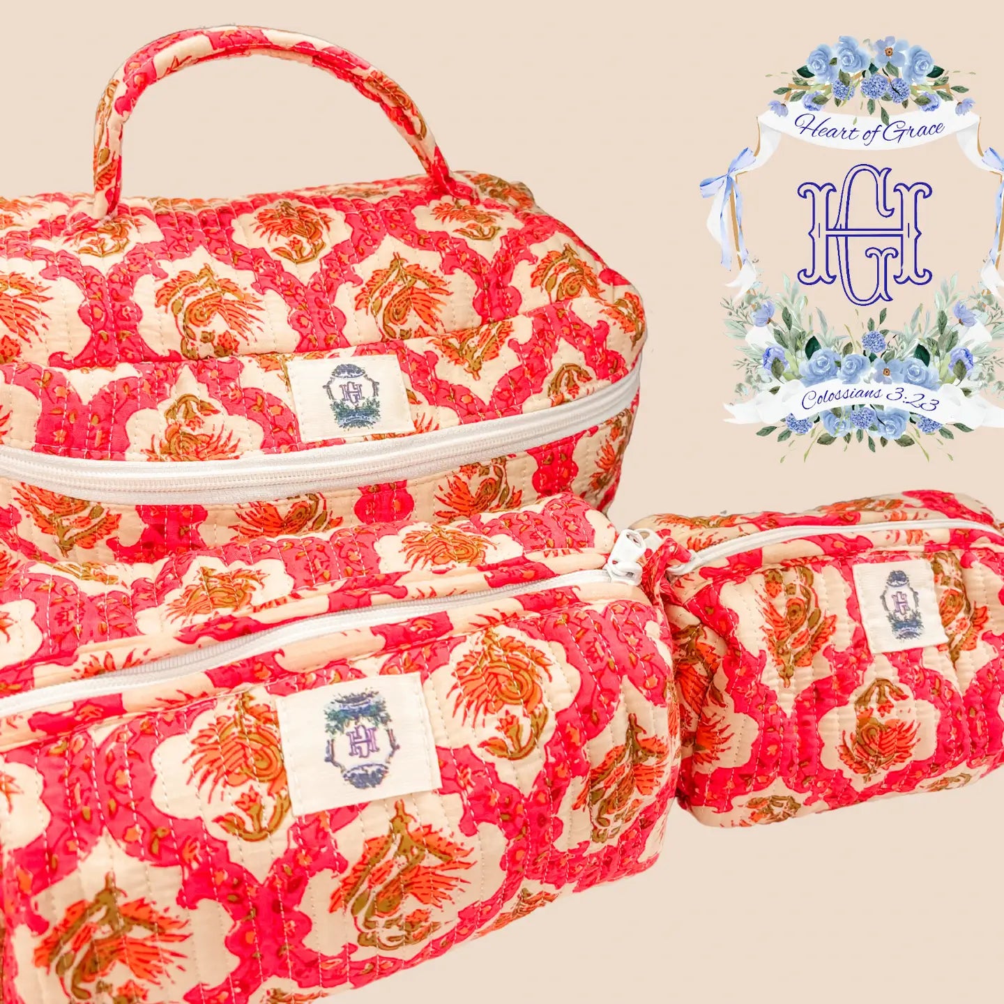 Our Heart of Grace Quilted Tote Collection will be a new customer favorite! These are hand quilted and crafted in India using block printing. The large bag has a printed fabric liner and the small/medium sized bags include a plastic liner for easy cleanup. Our cosmetic bags can also be washed, a double win! Lay these flat to dry to preserve quality. The block printing process may have variations in color, printing, and fabric as part of the handmade process which is what makes each product unique.