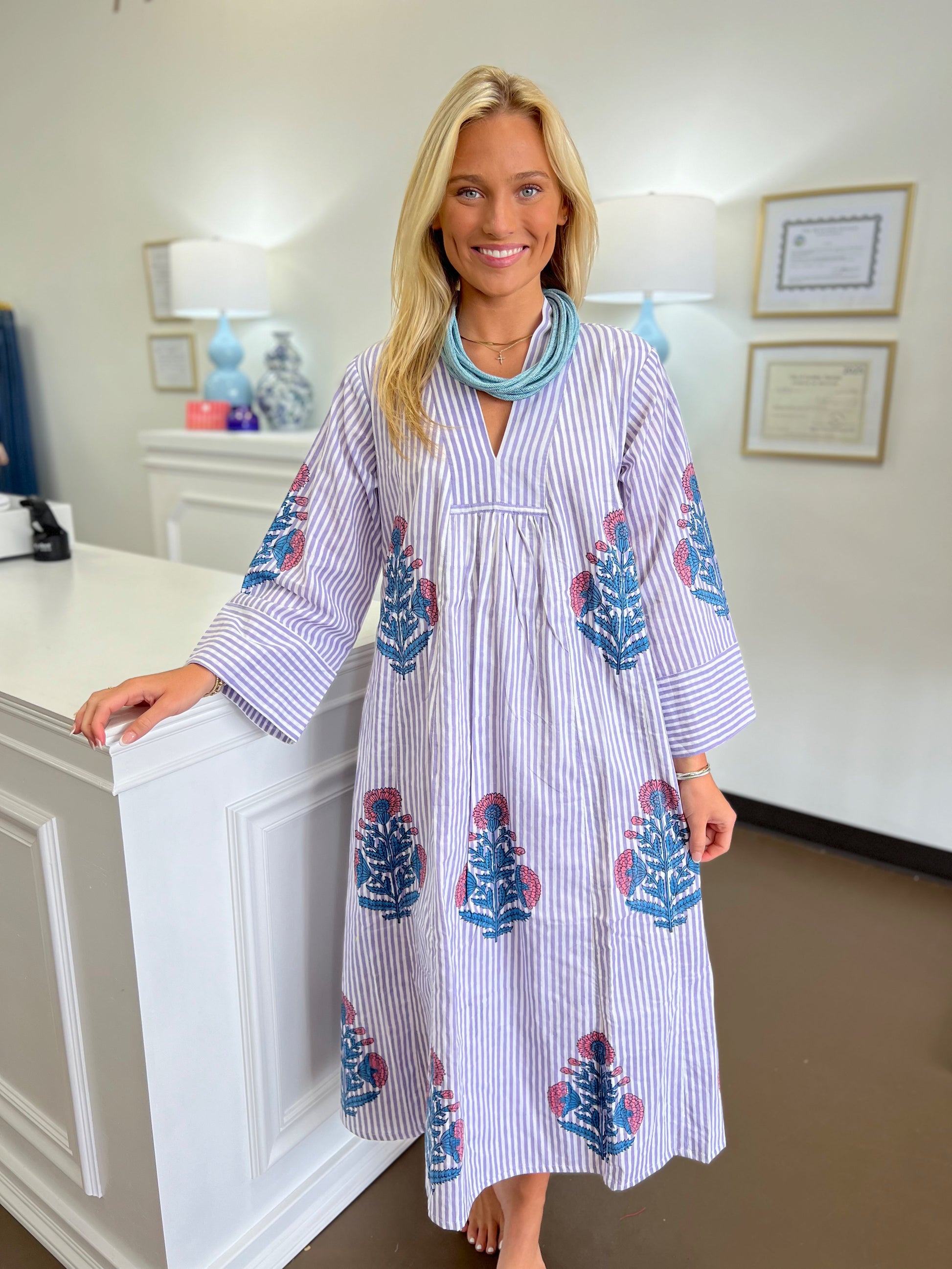 100% cotton lined This dress was handcrafted using block printing by skilled artisans in India. The block printing process may have variations in ink colors due to the handcrafted block printing process. Dresses can be machine washed on cool, air dry to preserve the quality of the block printing.