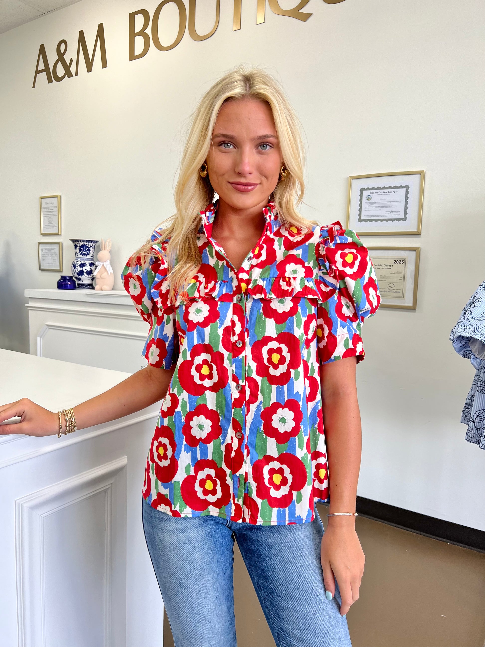 This Teagan Floral Printed Top brings a touch of femininity to your wardrobe. The structured shoulders and short puff sleeves create a flattering silhouette, while the ruffle finish adds a playful and romantic touch. The lightweight and breathable fabric makes it perfect for any occasion. Elevate your style with this versatile piece!