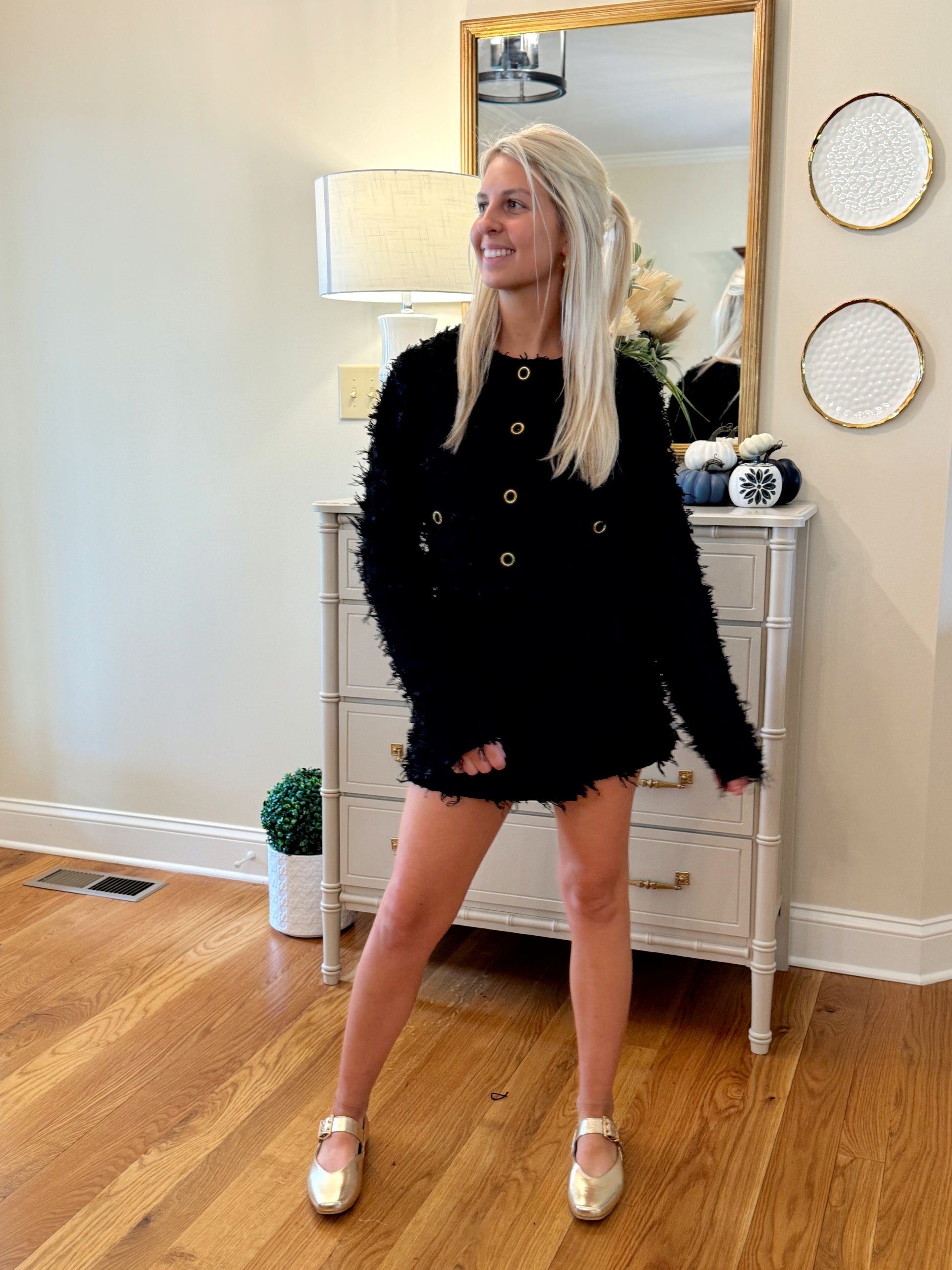 This tweed jacket and skirt set offers a classic and elegant look for any occasion. The long sleeve crop jacket adds texture and style, while the matching wrap style skort provides comfort and versatility. Perfect for a professional setting or a night out.